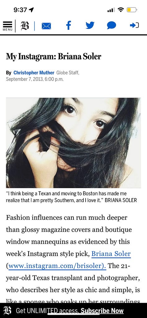 I googled myself before writing this which I don’t normally do but I was curious what would come up. Who is Briana Soler online? I saw my WordPress was high on the list so I logged on. Going back to that space, where I mostly wrote in Boston made me wince. I was so obviously always writing from a place of hurt, defense. Maybe I still am now. I flinch at how susceptible I was to naysayers and negative people. But I remind myself to be gentle. I read as much as I can stomach. I was writing for me, there was no audience, and I wrote with such vigor. It was a good reminder that I will always write no matter if my audience is only Hayden. Then I went back to Google and found an old article The Boston Globe wrote about me in 2013. They had an “Instagram Style Star” column I guess, where they would feature a new person each week. I still to this day have no idea why they selected me to do this interview. I scan the interview with one eye open, holding my phone at arm’s length away, rereading that I liked my cowboy boots and photography.